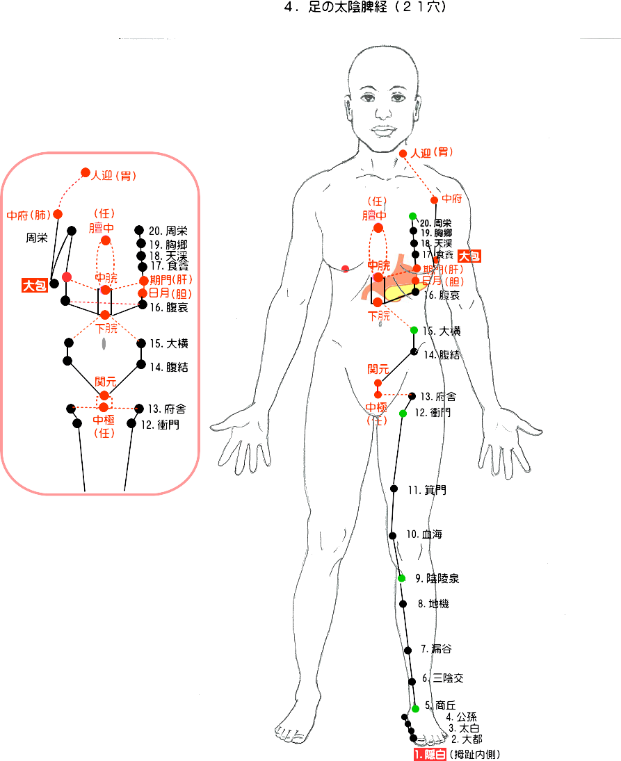 前胸部、第4肋間、前正中線の外方6寸。 |